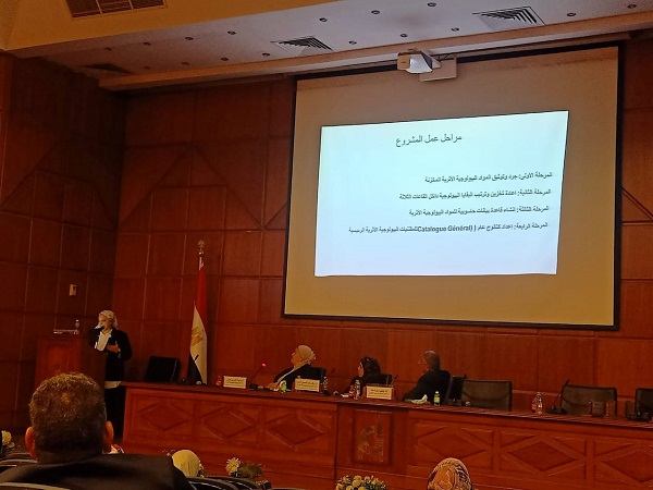 Преподаватель факультета искусств Университета Бени-Суэйф представляет достижения проекта по документации останков скелета в Египетском музее.