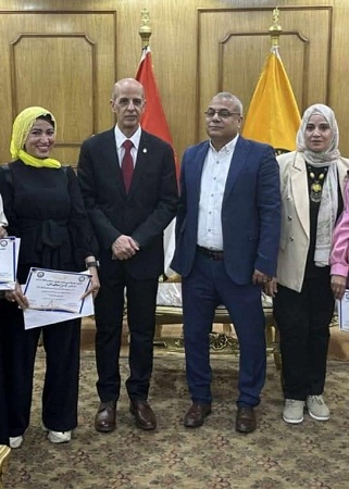 Декан факультета искусств Университета Бени-Суэйф чествует сотрудников колледжа, достигших пенсионного возраста.