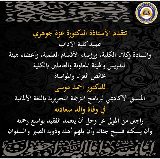 تتقدم الأستاذة الدكتورة / عزة جوهري عميدة كلية الآداب و اسرة كلية الآداب بخالص العزاء والمواساة للدكتور .......